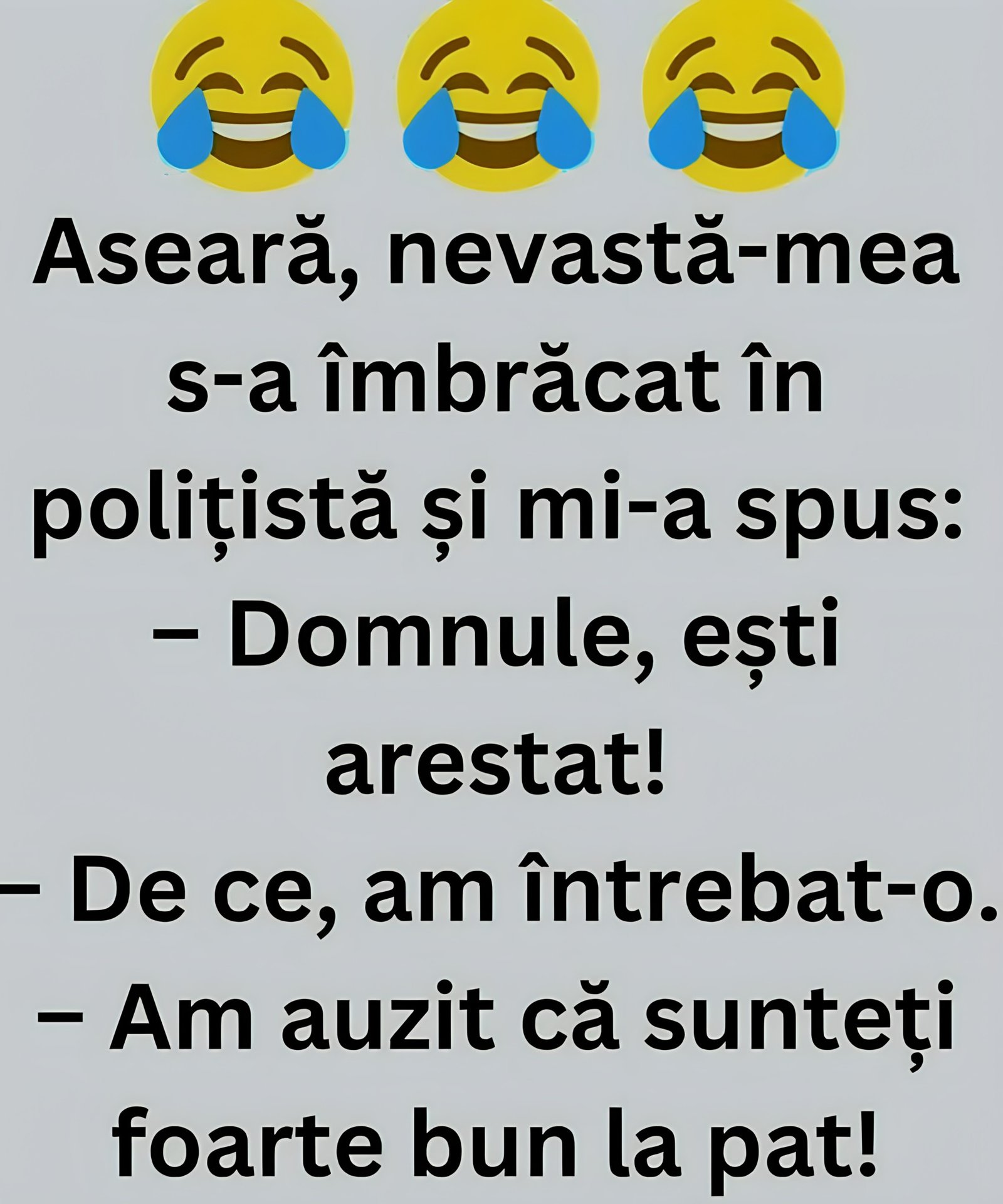 Din senin, ușa dormitorului s-a deschis larg, iar în prag a apărut soția lui – îmbrăcată într-o uniformă de polițistă care îi venea perfect. Cu o atitudine jucăușă, dar hotărâtă, ținând în mână o pereche de cătușe strălucitoare, s-a apropiat și, cu o voce serioasă, a rostit: „Domnule, ești arestat!”